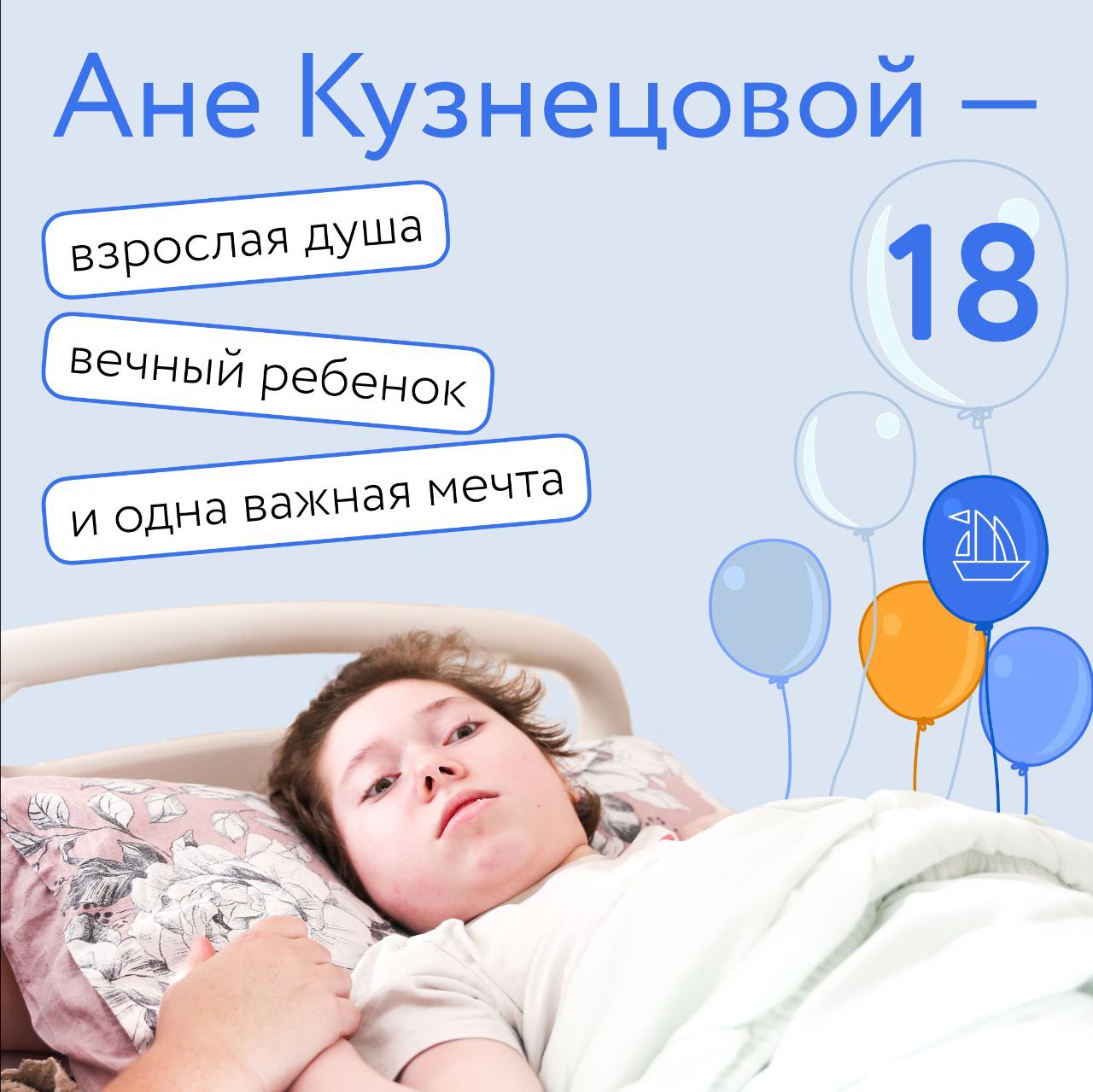 Скоро особенный день — нашей Ане Кузнецовой исполняется 18 лет! Для её мамы, Светланы, и для всех нас, кто знает Анюту, она навсегда останется вечным, любимым ребенком, нуждающимся в нашей заботе.